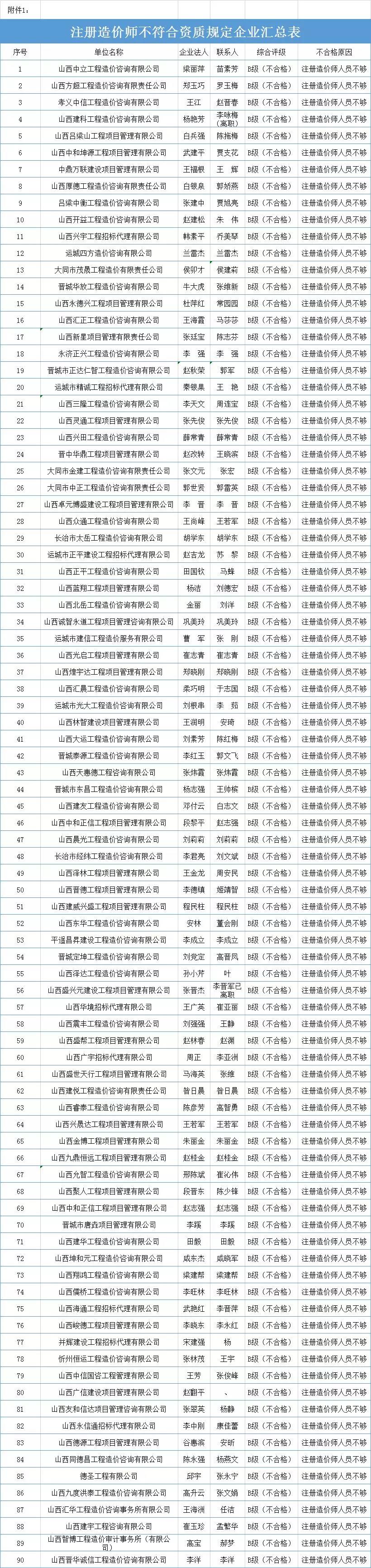 2019年7月1日,山西省住建厅发布《关于开展工程造价咨询市场专项治理的通知》(第715号),通报90家造价企业10天内整改,原因均为注册造价师数量不足。主要内容如下: