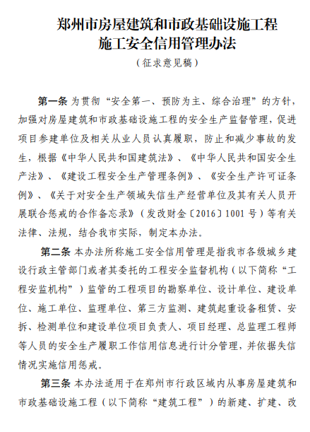 为进一步加强全市建筑施工领域安全生产工作,有效防范遏制生产安全事故发生,切实保护人民群众生命财产安全,我局拟定了《郑州市房屋建筑和市政基础设施工程施工安全信用管理办法》,现向社会公开征求意见。