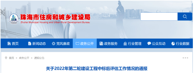 根据《珠海市建设工程中标后评估工作规则(2022年版)》(珠建招〔2022〕14号)规定,市住房城乡建设局开展了2022年第二轮建设工程中标后评估工作,现将相关情况通报如下: